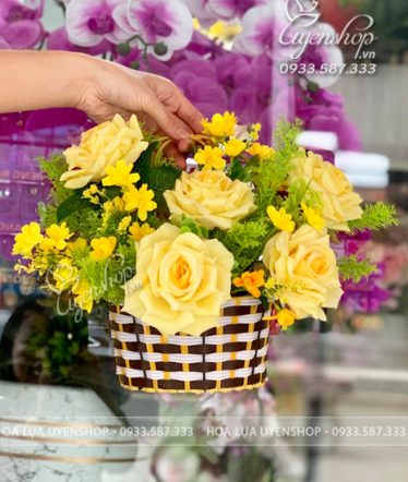 Giỏ hoa treo tường kết hợp các mẫu hoa khác nhau theo tone màu tươi tắn, nổi bật, tạo nét mới lạ cho những kiểu dáng treo tường. Bạn có thể treo trên góc nhà, hoặc decor quán cà phê, nhà hàng cho không gian thêm sinh động hơn.