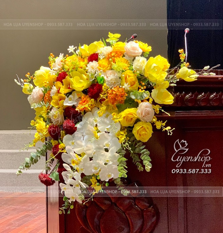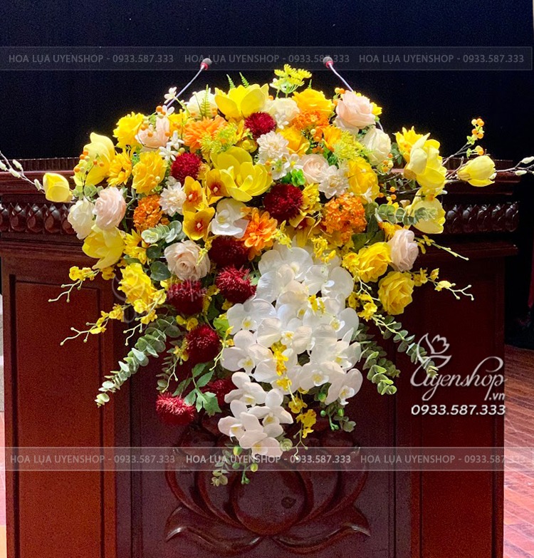 Mẫu hoa bục phát biểu thiết kế kết tone vàng chủ tạo pha chút sắc đỏ và cam tạo nên một tổng thể hài hòa mang nét tươi sáng, sang trọng.