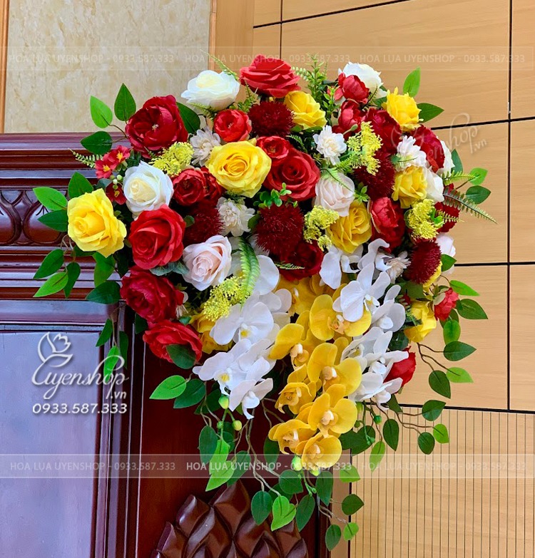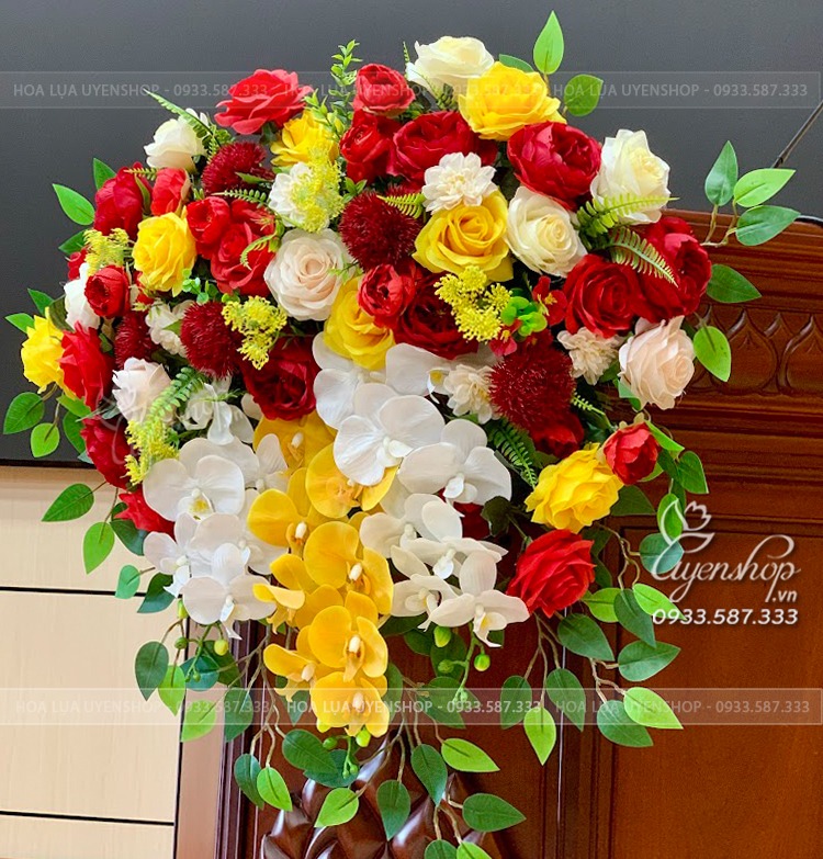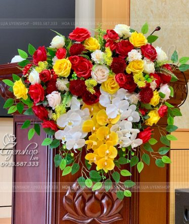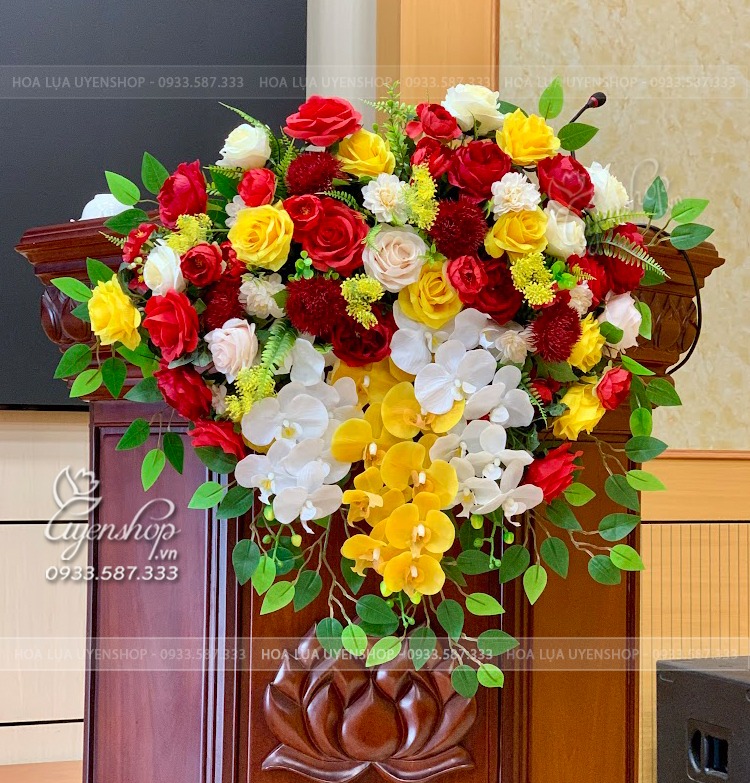 Mẫu hoa bục phát biểu thiết kế kết tone vàng chủ tạo pha chút sắc đỏ tạo nên một tổng thể hài hòa mang nét tươi sáng, sang trọng.