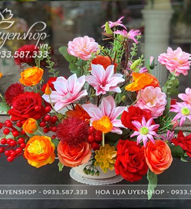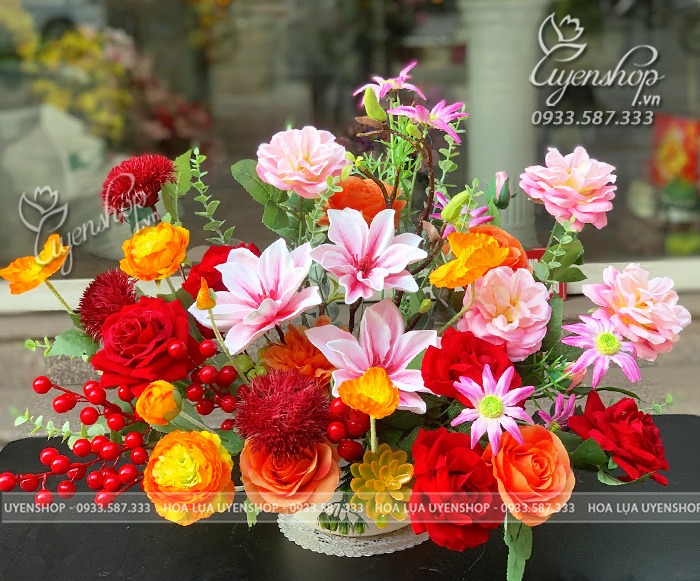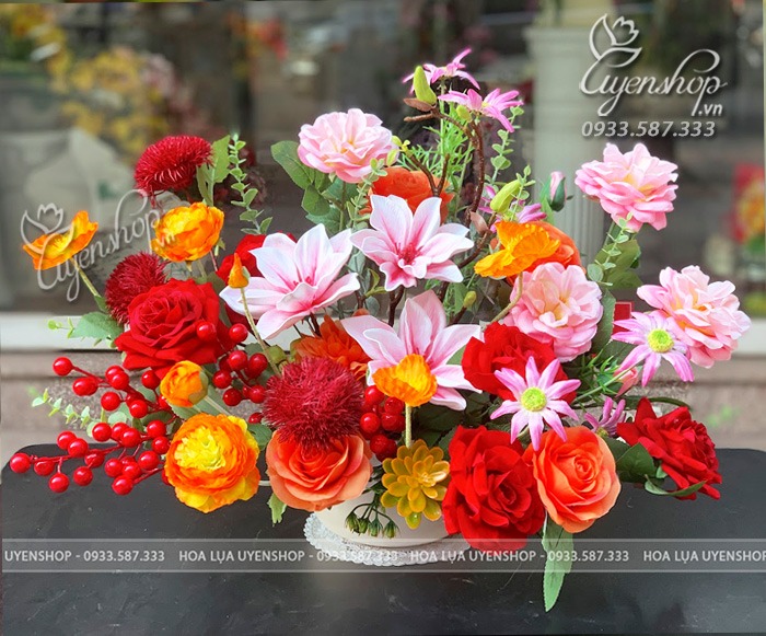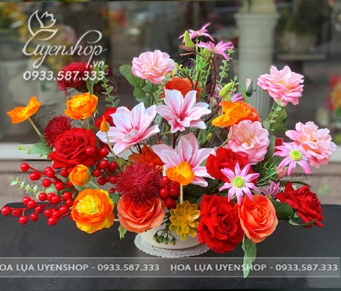 Bình hoa và hoa có kích thước cao 45cm, xòe rộng 50cm.