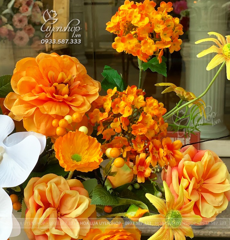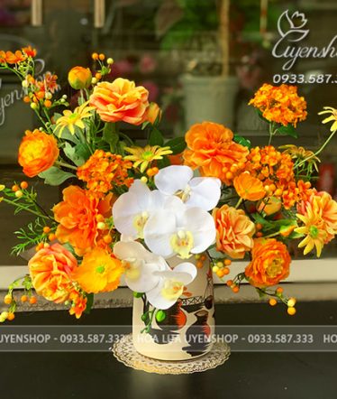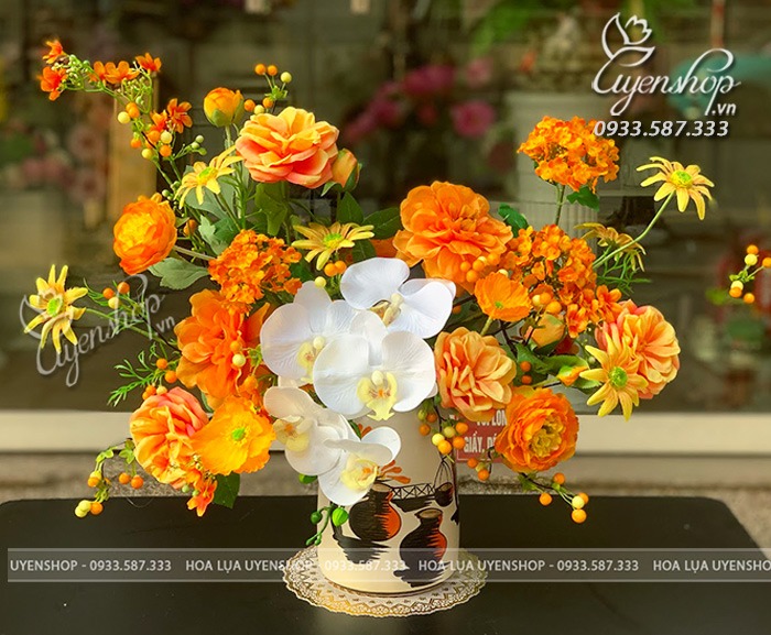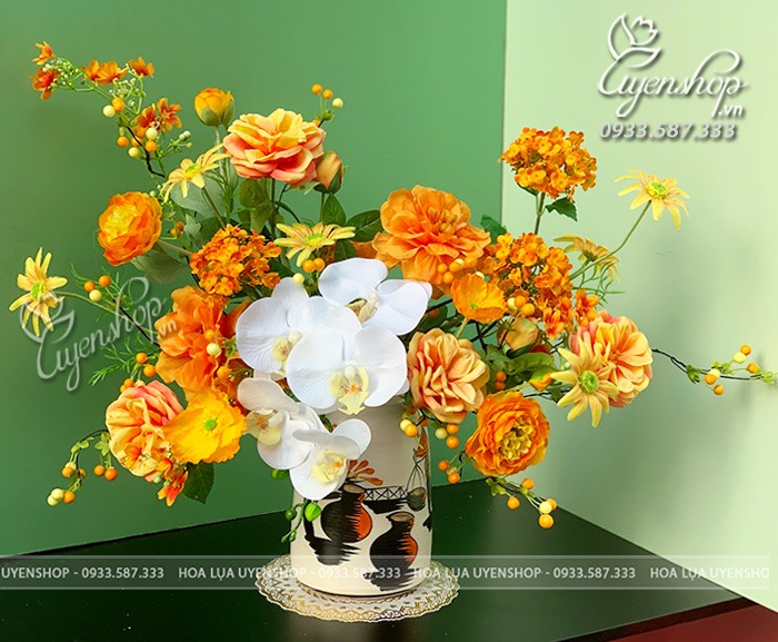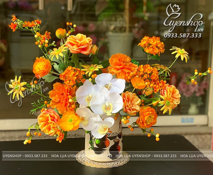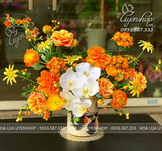 Bình hoa gây ấn tượng với tông cam nổi bật, kết hợp hài hòa giữa lan hồ điệp và hoa hồng tạo nên tổng thể mềm mại và tinh tế. Cách cắm tự nhiên giúp bình hoa trông sinh động nhưng vẫn giữ được sự sang trọng.