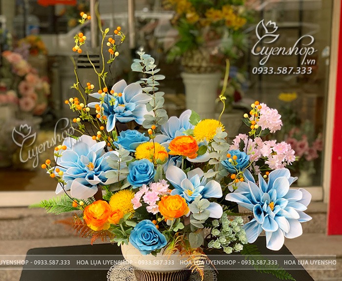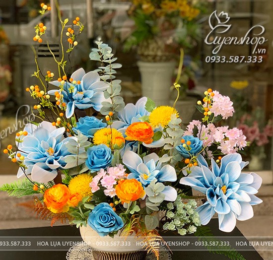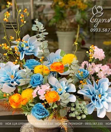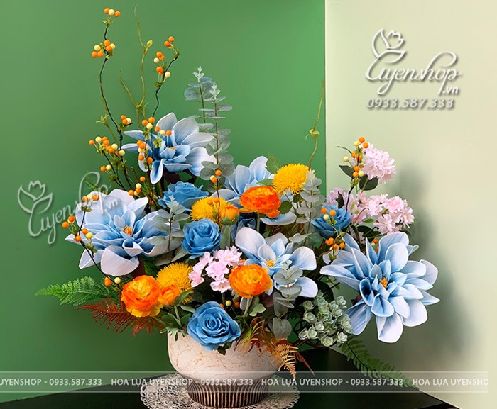 Tác phẩm gây ấn tượng với sự kết hợp nổi bật giữa hoa xanh dịu mát, điểm sắc vàng tươi và sắc cam ấm, tạo nên tổng thể cân bằng và cuốn hút. Các gam màu được phối khéo léo, giúp bình hoa vừa nổi bật vừa không quá rực, mang lại cảm giác dễ chịu cho không gian.