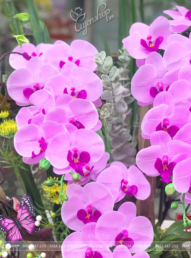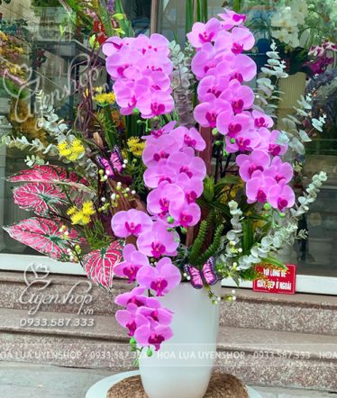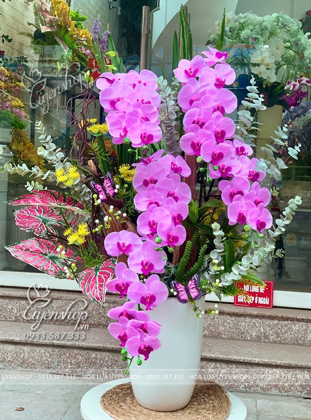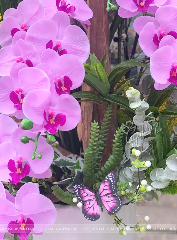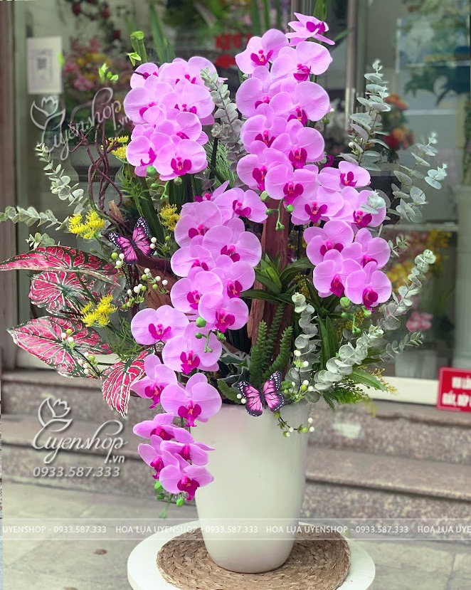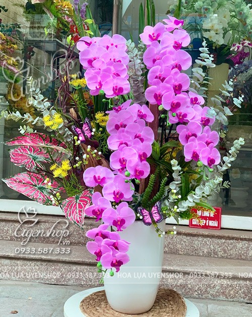 Hoa lụa cao cấp giúp chậu lan luôn tươi mới, không phai màu, không cần chăm sóc, nhưng vẫn giữ trọn vẻ đẹp đẳng cấp theo thời gian.