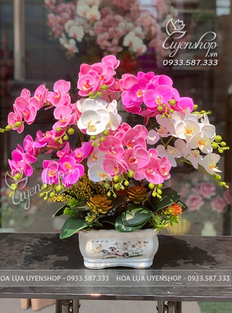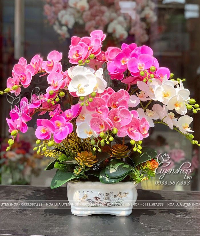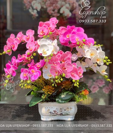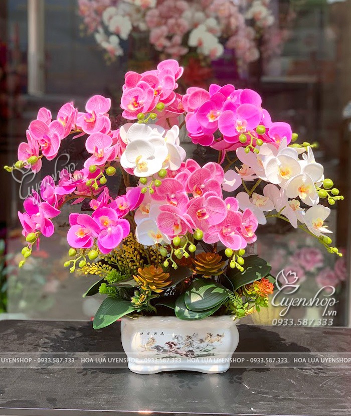 Chậu lan hồ điệp mix tone hồng tím duyên dáng, nhẹ nhàng mà vẫn nổi bật, phù hợp trang trí bàn trà phòng khách, bàn ăn hay làm quà tặng dịp khai trương, sinh nhật…