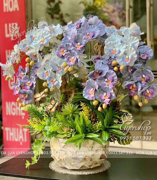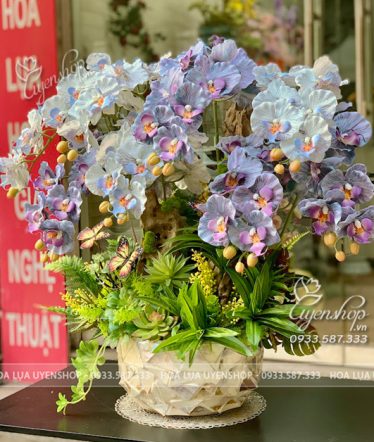 Lan hồ điệp tông xanh lam mang ý nghĩa bình an, trí tuệ và sự hanh thông trong phong thủy, phù hợp với những người thuộc mệnh Thủy và mệnh Mộc – tạo cảm giác thư thái và ổn định cho không gian sống và làm việc
