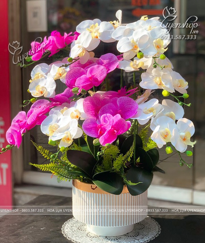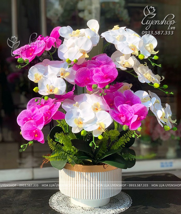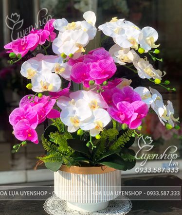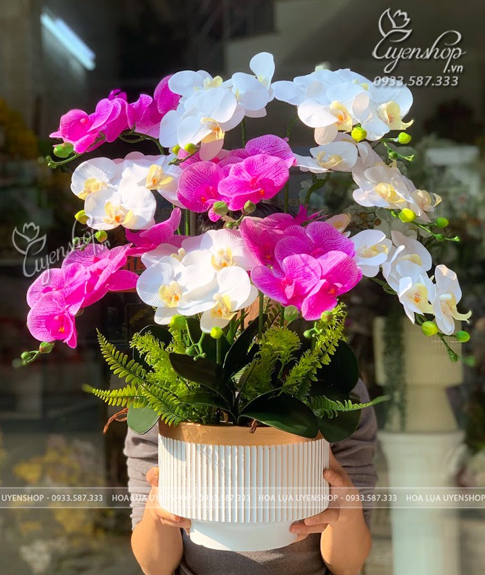Chậu hoa được cắm dáng một phía. Hoa lụa cao cấp giúp chậu lan luôn tươi mới, không phai màu, không cần chăm sóc, nhưng vẫn giữ trọn vẻ đẹp đẳng cấp theo thời gian.