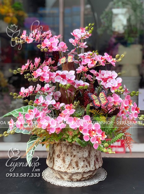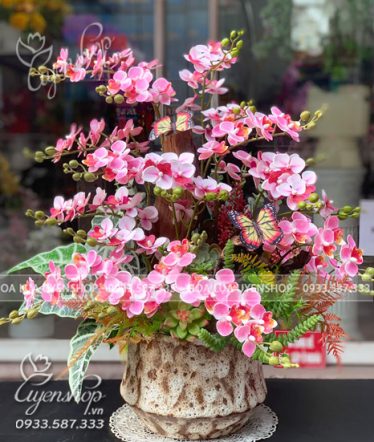 Chậu Lan Tiểu Hồ Điệp hồng mang vẻ đẹp nhẹ nhàng, tinh tế với sự chuyển màu hài hòa giữa các cánh hoa. Từng nhành lan được cắm tỉ mỉ, tạo cảm giác mềm mại, cân đối và rất tự nhiên.