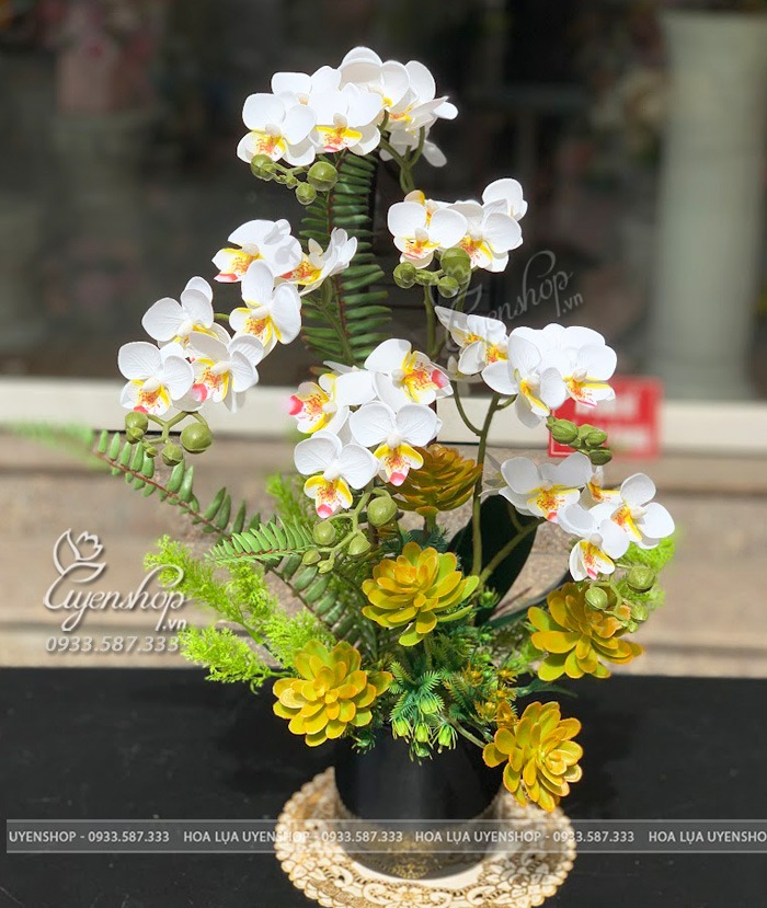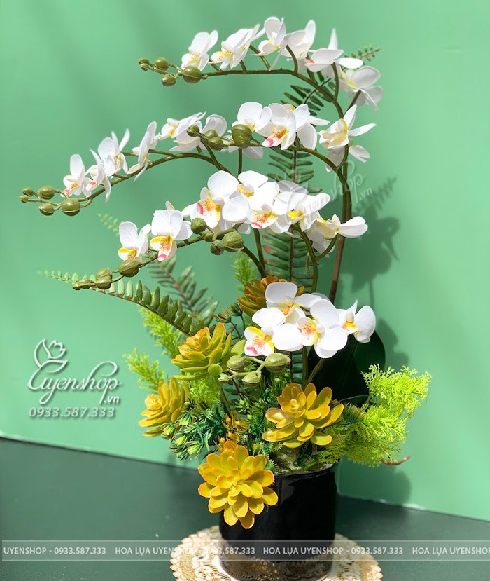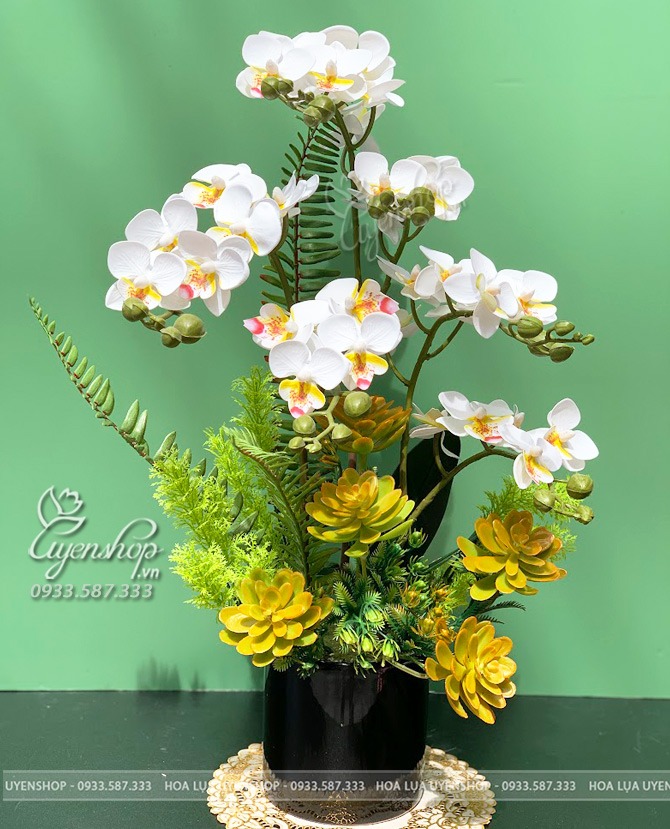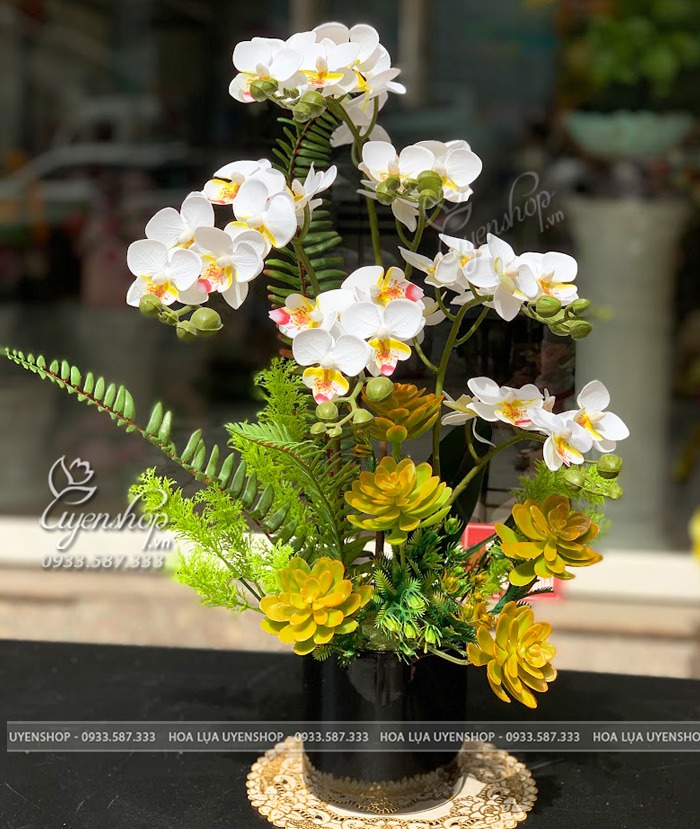 Mẫu hoa lan tiểu hồ điệp trắng mang vẻ đẹp sang trọng, trang nhã.Bình hoa thích hợp trang trí bàn làm việc, quầy lễ tân, phòng khách hoặc làm quà tặng dịp khai trương, tân gia, kỷ niệm.