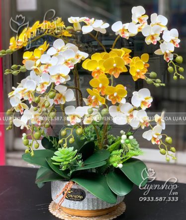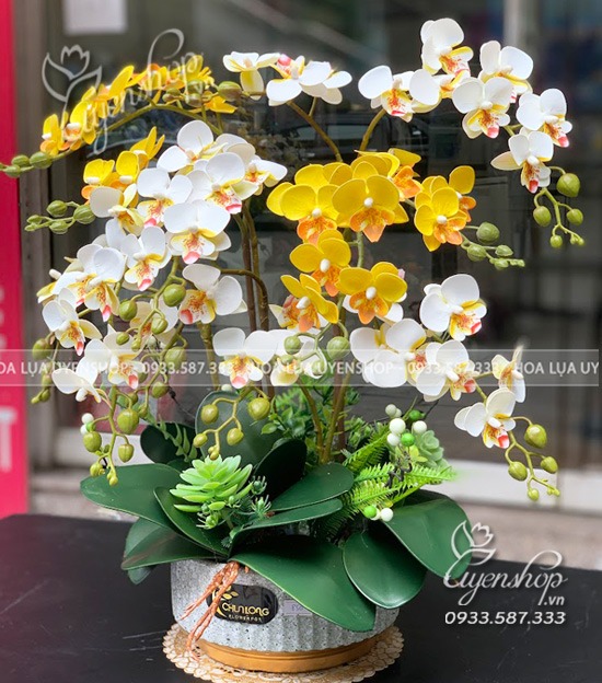 Một thiết kế nhỏ xinh nhưng đầy cuốn hút, chậu lan tiểu hồ điệp với Sự kết hợp màu trắng-vàng hài hòa mang lại cảm giác tươi sáng, sang trọng, là điểm nhấn hoàn hảo cho bàn làm việc, bàn tiếp khách, hoặc làm quà tặng đầy tinh tế.