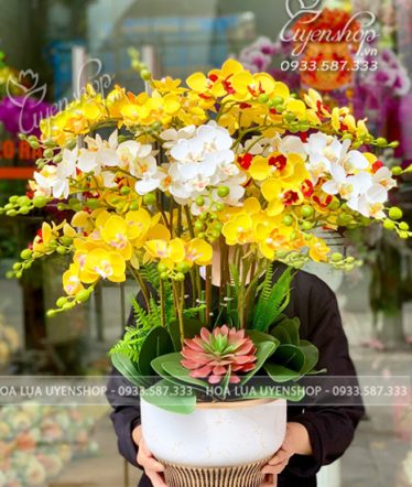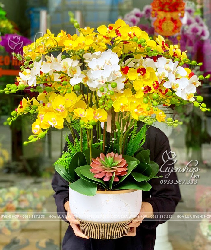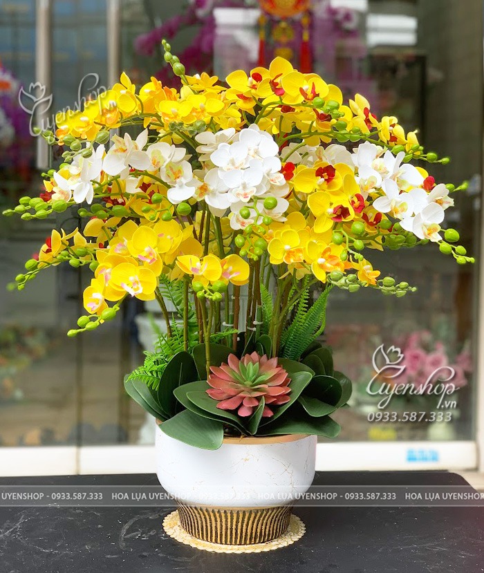 Màu vàng của lan tượng trưng cho tài lộc, thịnh vượng và thành công, rất được ưa chuộng để trang trí phòng khách, quầy lễ tân, văn phòng hoặc làm quà tặng khai trương, mừng năm mới,
