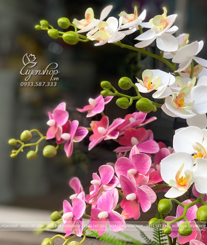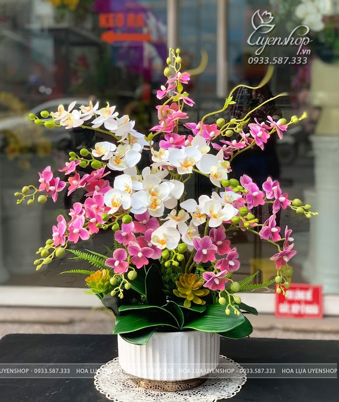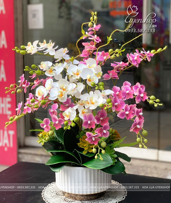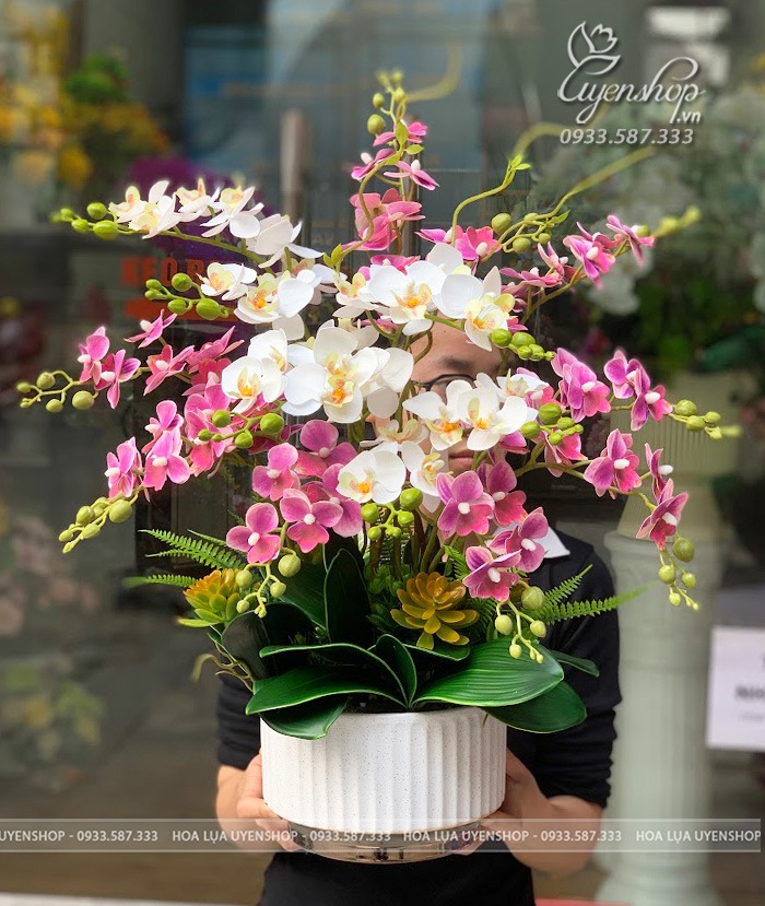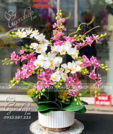Chậu Lan Tiểu Hồ Điệp tím- trắng mang vẻ đẹp nhẹ nhàng, tinh tế với sự chuyển màu hài hòa giữa các cánh hoa. Từng nhành lan được cắm tỉ mỉ, tạo cảm giác mềm mại, cân đối và rất tự nhiên.