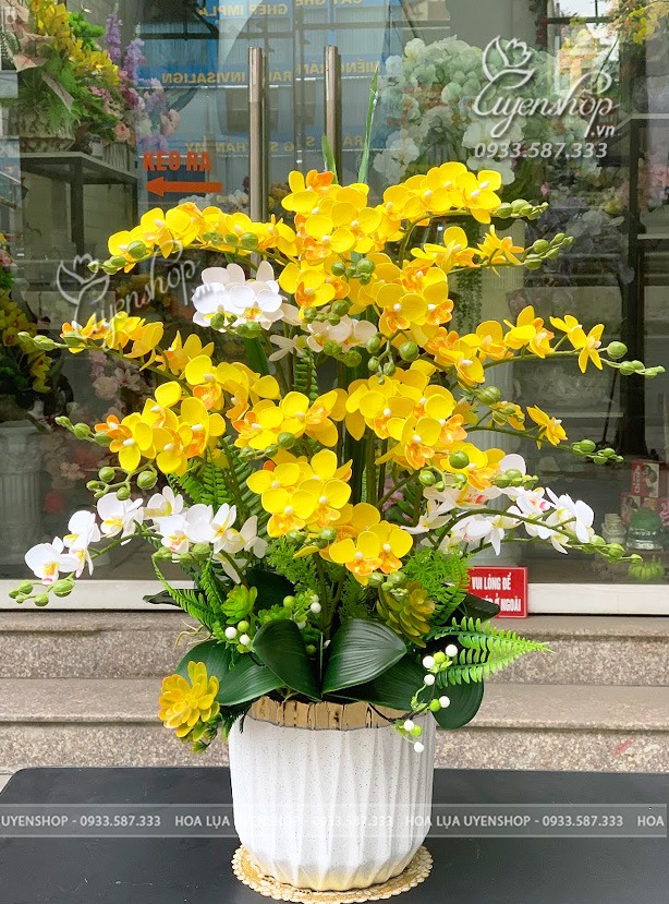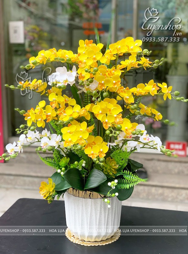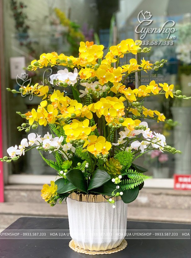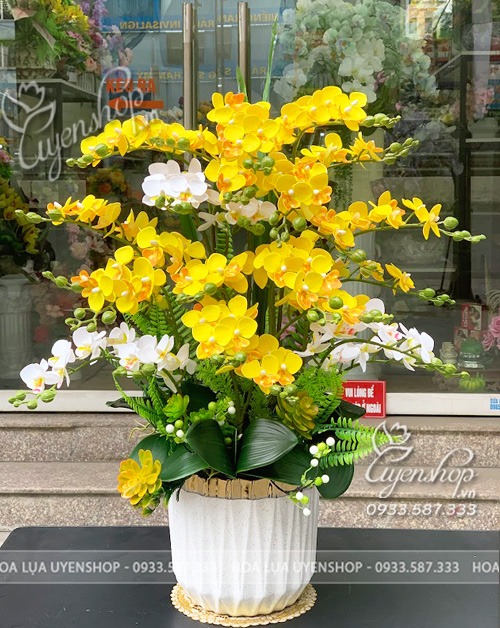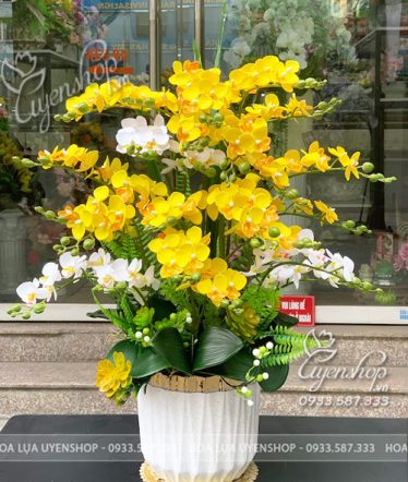 Sản phẩm sử dụng hoa lụa cao cấp, giữ form đẹp lâu dài, là lựa chọn lý tưởng cho khách hàng yêu thích vẻ đẹp lan nhưng muốn sự tiện lợi và bền bỉ.