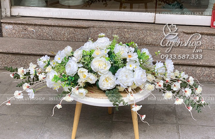 Mẫu hoa sự kiện thiết kế kiểu vòm cong mềm mại, kết hợp giữa các loài hoa trắng như hoa trà, mẫu đơn… và hoa nhỏ, điểm xuyết cành uốn thanh thoát.