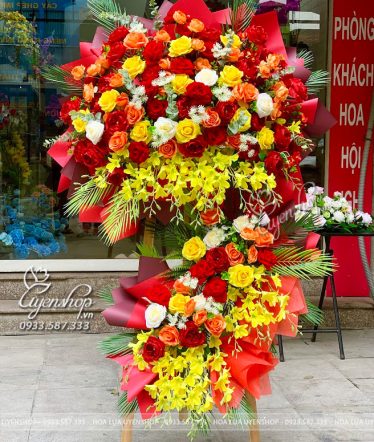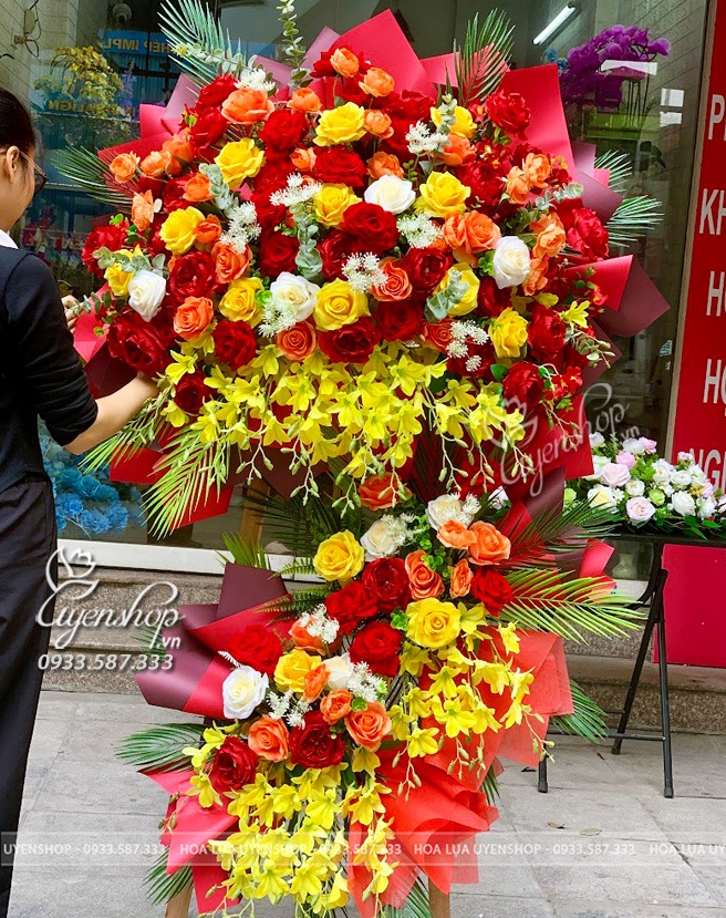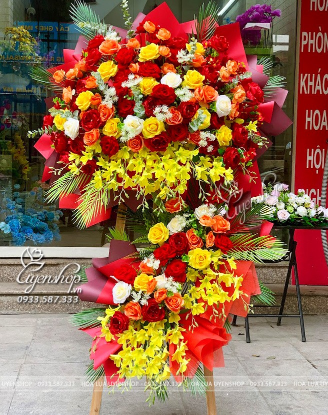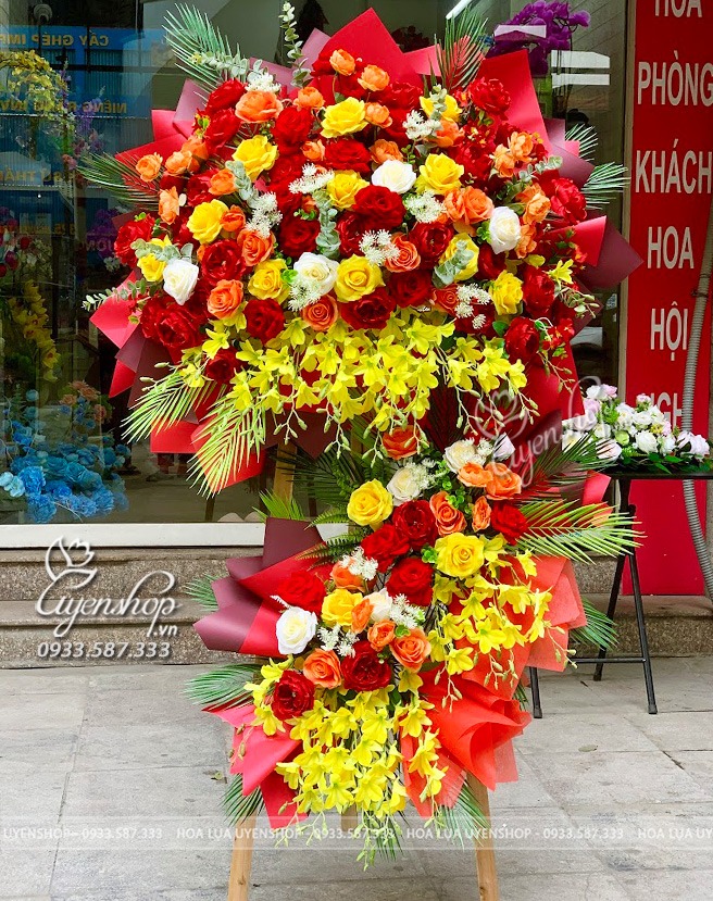 Lãng hoa lụa 2 tầng hoa tặng khai trương phong cách hiện đại, kết hợp giữa hoa hồng, mẫu đơn, hoa trà, thược dược giúp lãng hoa trở nên xinh xắn tưởng như lãng hoa tươi. Hoa không chỉ để tặng khai trương, chúc mừng lấy xe,…., là lãng hoa trang trí lâu dài cho không gian của nhà, của showroom mình.