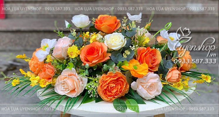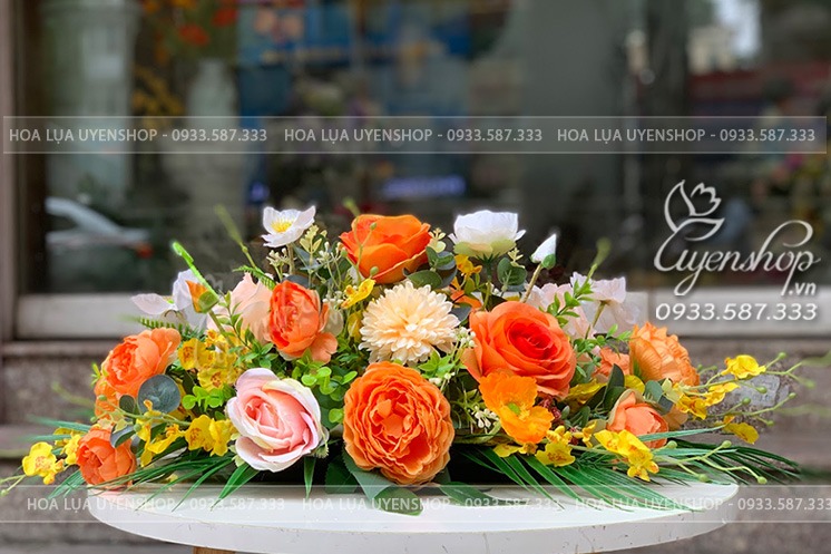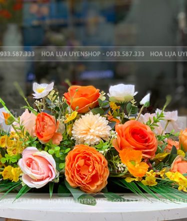 Lãng hoa bàn họp với tone màu cam nổi bật mà vẫn sang trọng. Một lãng hoa xinh xắn với sự kết hợp khéo léo giữa hoa hồng, mãu đơn,…sẽ là một điểm nhấn cho văn phòng hay sự kiện của các buổi meeting,…