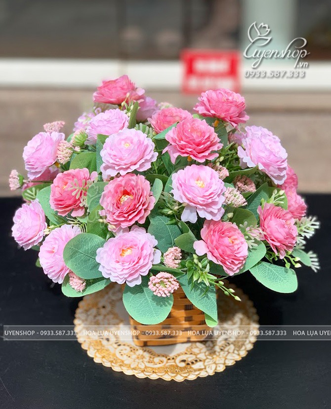 Bình hoa và hoa có kích thước cao 25cm, xòe rộng 25cm.