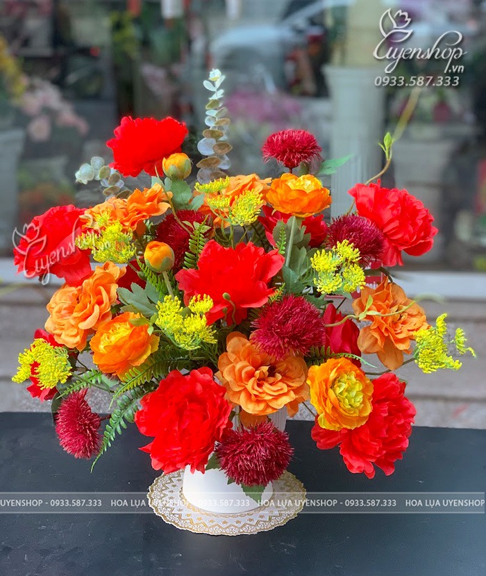 Bình hoa và hoa có kích thước cao 50cm, xòe rộng 45cm.