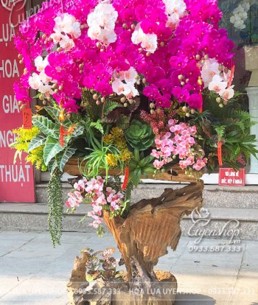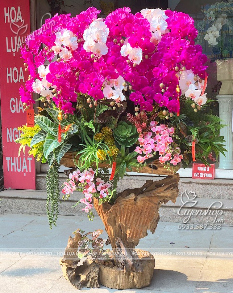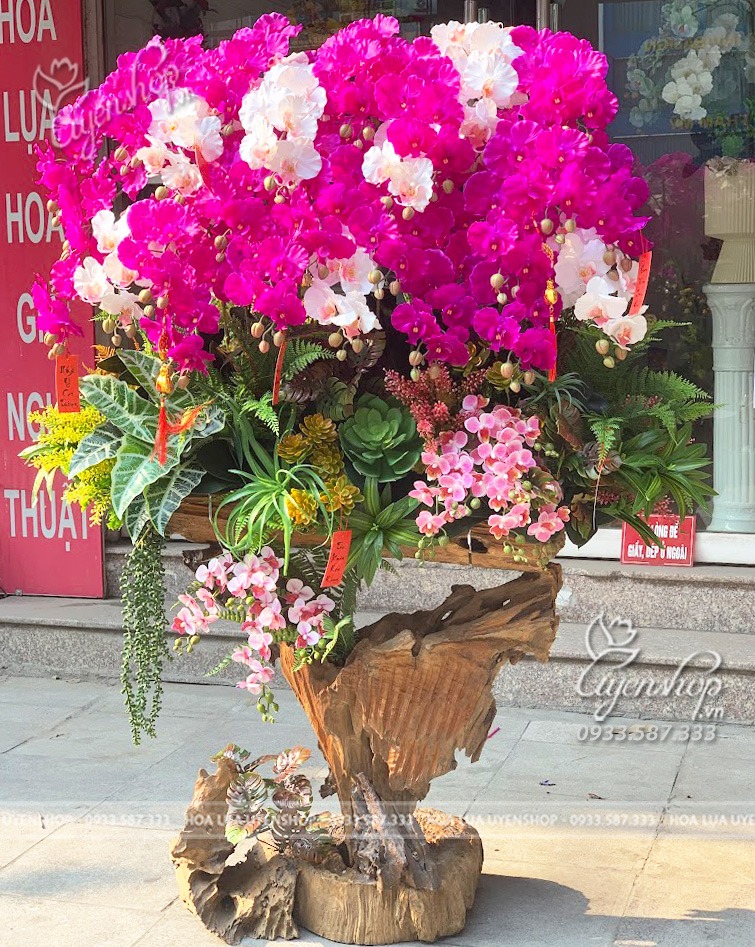 Mẫu lan hồ điệp lũa nghệ thuật gây ấn tượng mạnh với thiết kế quy mô lớn, kết hợp giữa lan hồ điệp sắc tím rực rỡ và đế gỗ lũa tự nhiên đầy tính mỹ thuật. Tổng thể tạo nên vẻ đẹp vừa sang trọng, vừa gần gũi với thiên nhiên.