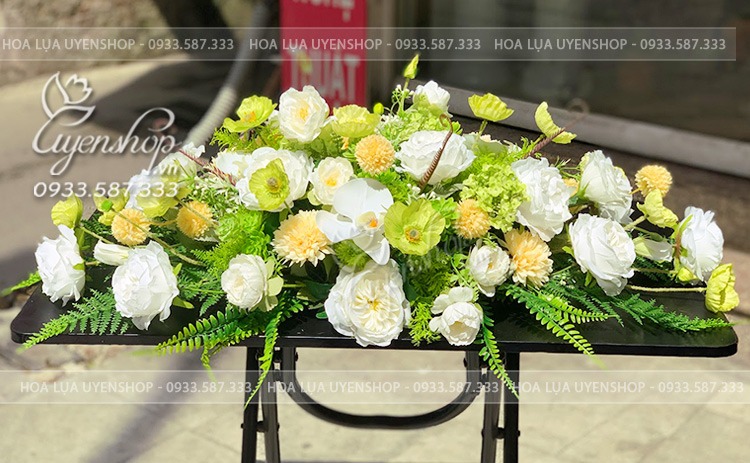 Lãng hoa tone màu xanh cốm nhẹ nhàng với các loại hoa như hoa hồng, hoa trà, thược dược… tạo nên được một lãng hoa vô cùng tươi tắn và sinh động.