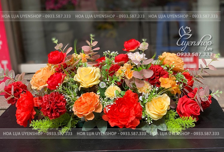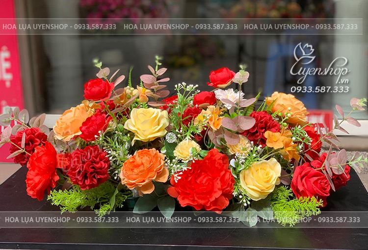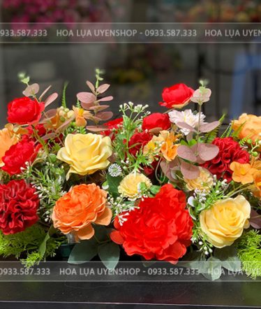 Lãng hoa lụa để bàn với tone đỏ cam rực rỡ. Một lãng hoa xinh xắn với cách cắm tự nhiên, tone màu nổi bật sẽ là một điểm nhấn cho văn phòng hay sự kiện của các buổi meeting,…