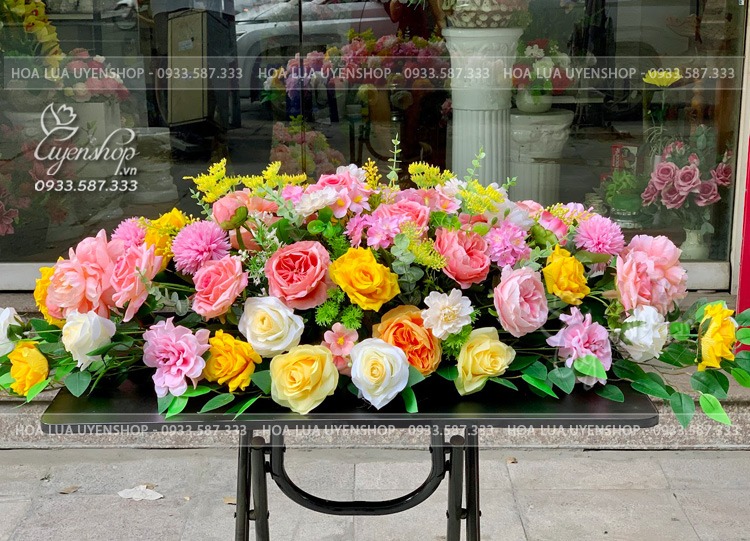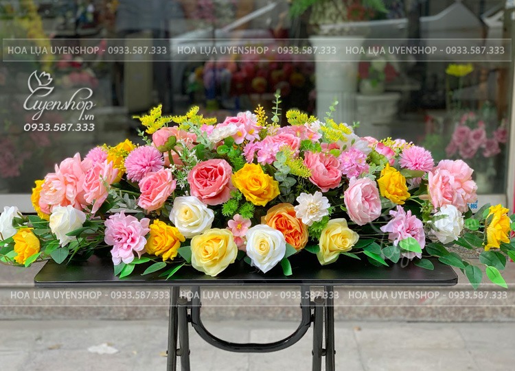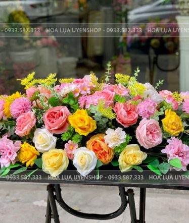 Lãng hoa lụa để bàn với tone hồng mix vàng kem mới mẻ. Một lãng hoa xinh xắn với cách cắm tự nhiên, tone màu nổi bật sẽ là một điểm nhấn cho văn phòng hay sự kiện của các buổi meeting,…
