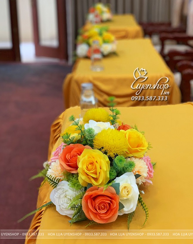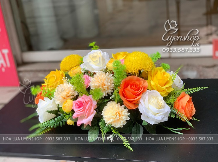 Lãng hoa lụa để bàn với tone hồng mix vàng kem mới mẻ. Một lãng hoa xinh xắn với cách cắm tự nhiên, tone màu nổi bật sẽ là một điểm nhấn cho văn phòng hay sự kiện của các buổi meeting,…