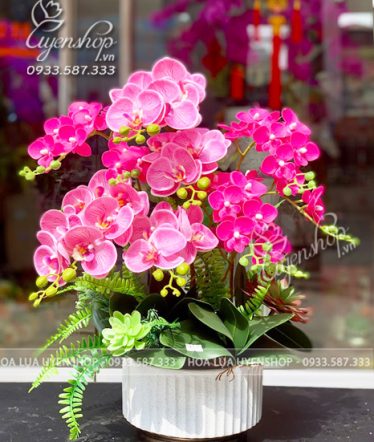 Chậu lan hồ điệp tone hồng duyên dáng, nhẹ nhàng mà vẫn nổi bật, phù hợp trang trí bàn trà phòng khách, bàn ăn hay làm quà tặng dịp khai trương, sinh nhật…