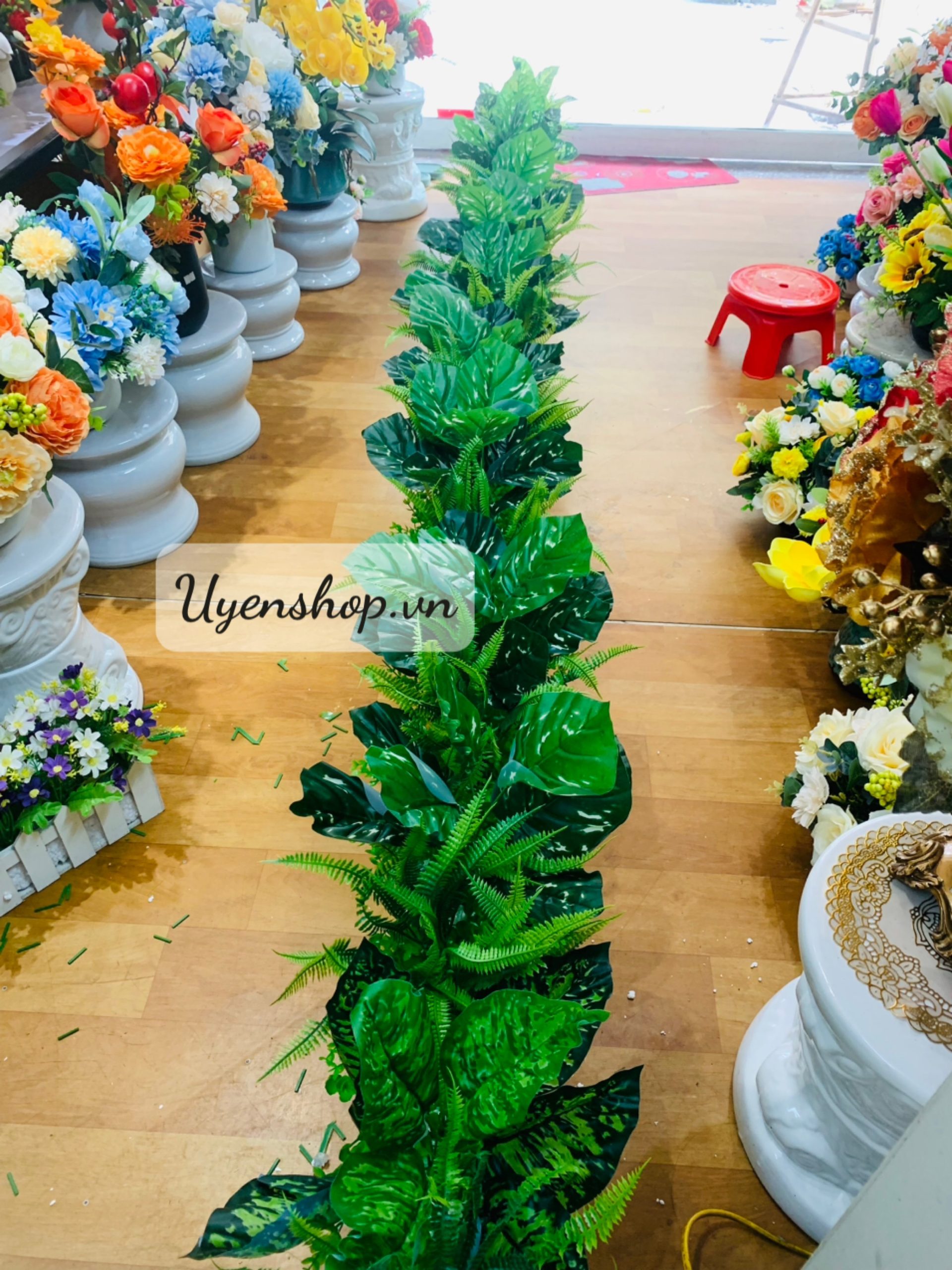 Dùng khung composite nhẹ treo qua lan can bằng dây nylon và móc chữ J ôm thanh dưới. Toàn bộ lá/hoa gắn lên khung; khi chuyển nhà, tháo xuống không để lại dấu.